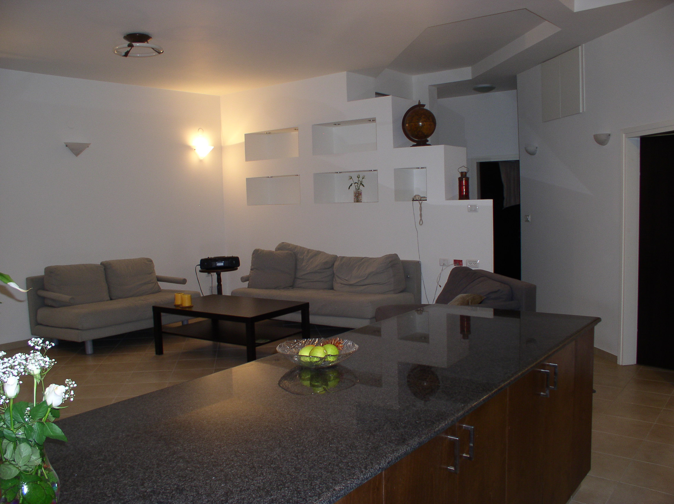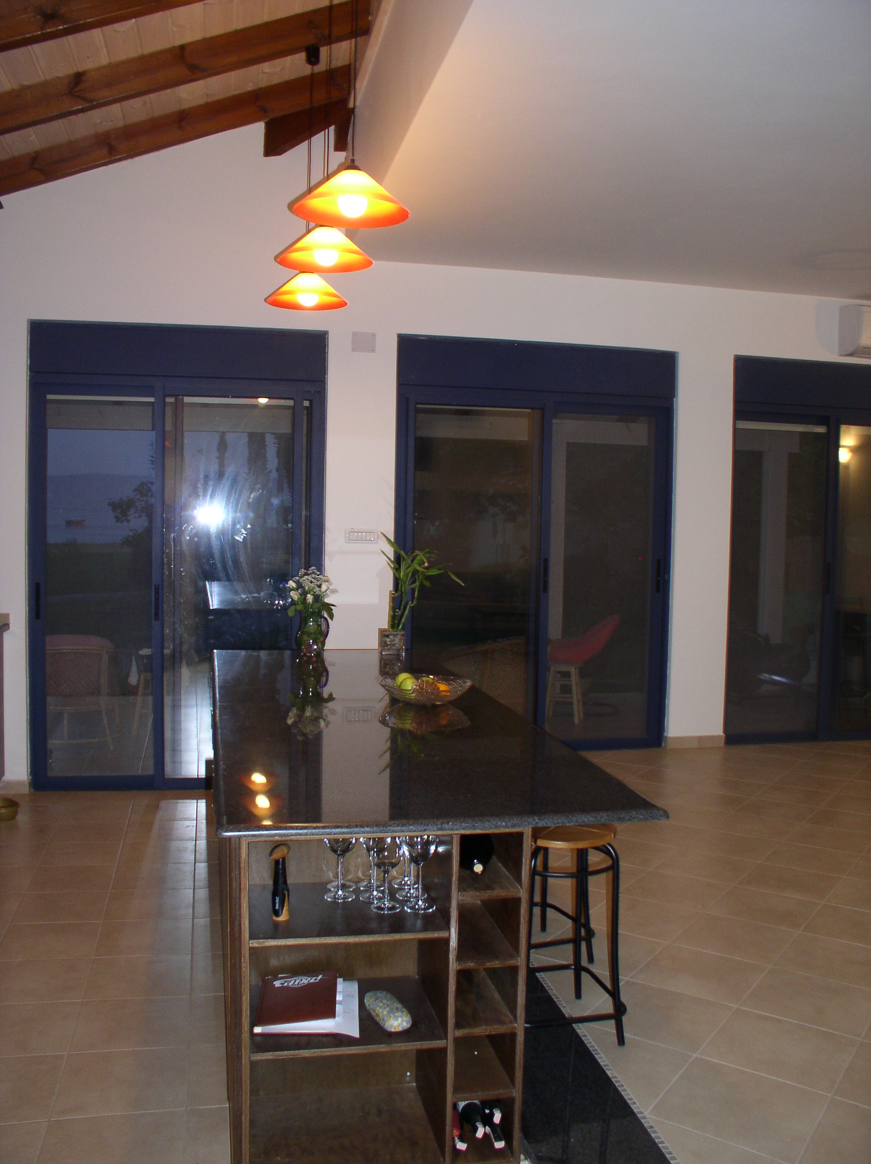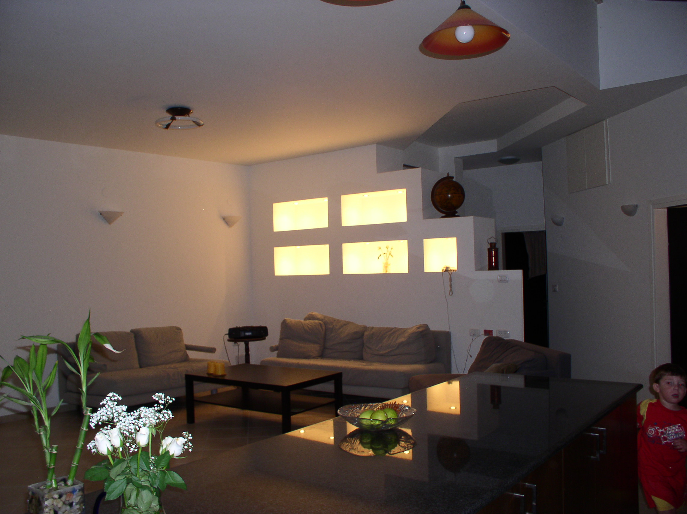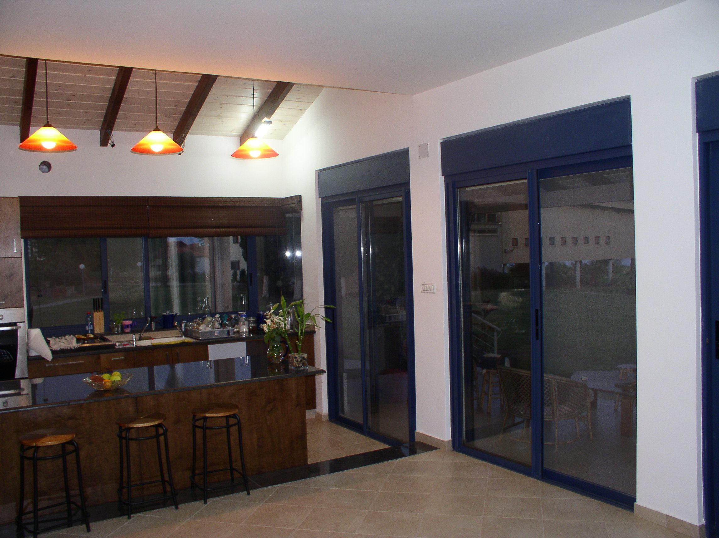 שבירת המלבן. הבית נבנה במגרש קטן במיוחד ובעצם קווי הבית החיצוניים נבנו בהתאם לקוי הבניה של המגרש. צורת הבית היחידה האפשרית הייתה מלבן. בנוסף, אחד מצדי הבית היה חסום לפתחים בגלל מיבנה נוסף שהיה צמוד אליו בקו 0. שבירת המלבן נעשתה על ידי מרפסת עם גג רעפים כחולים ותקרת עץ החודרת לתוך המבנה ומהווה תיקרה חמה וביתית למטבח. בסלון ניבנה קיר נישות עם תאורה הנותן תחושה של פתיחות וחלונות במקום שלא ניתן היה לפתוח חלונות.