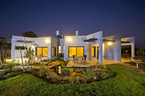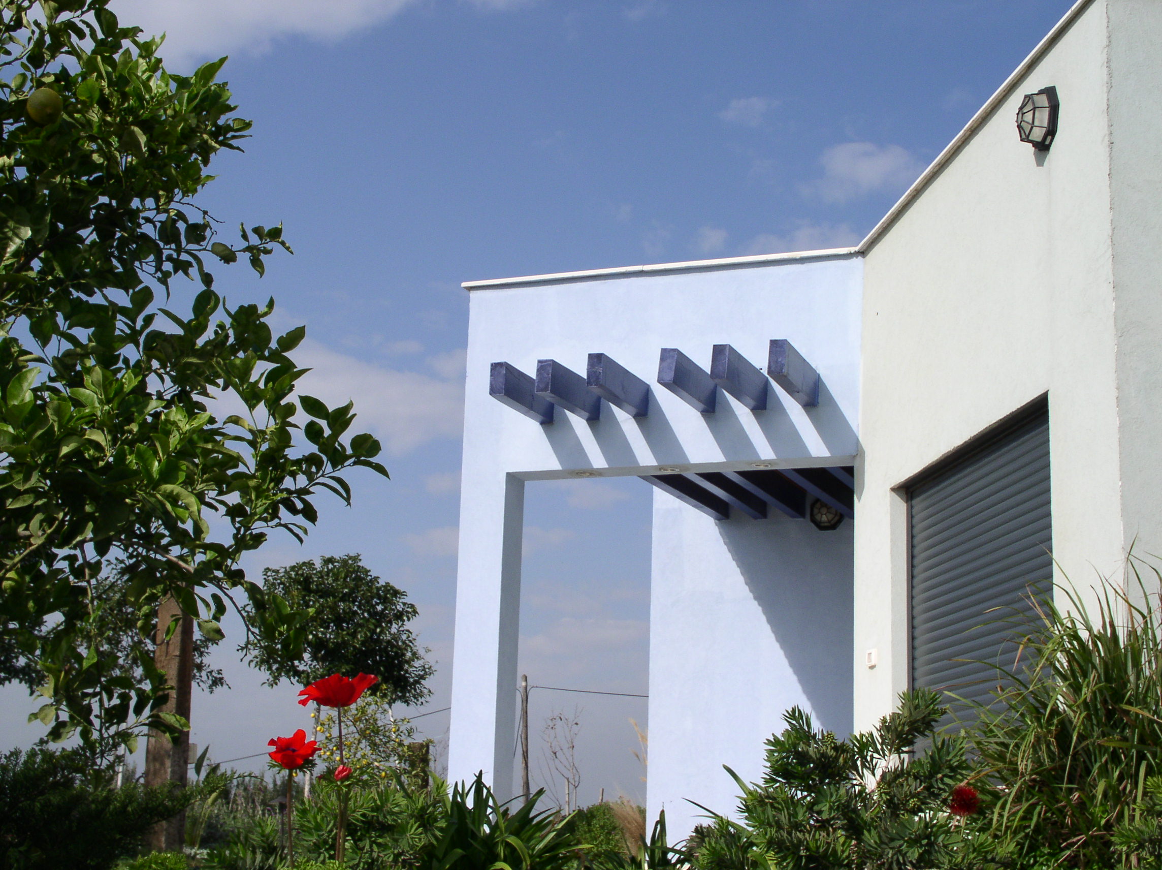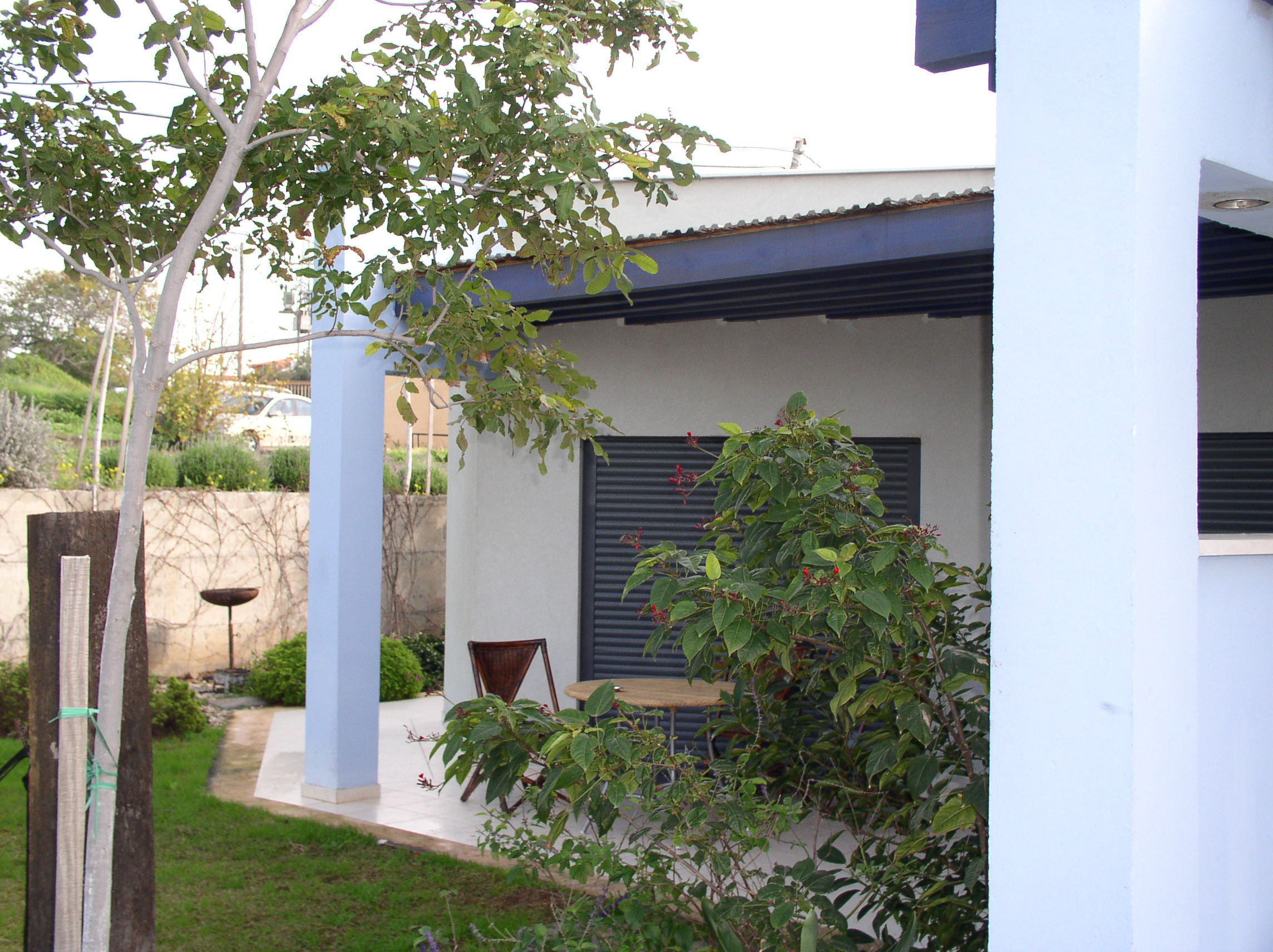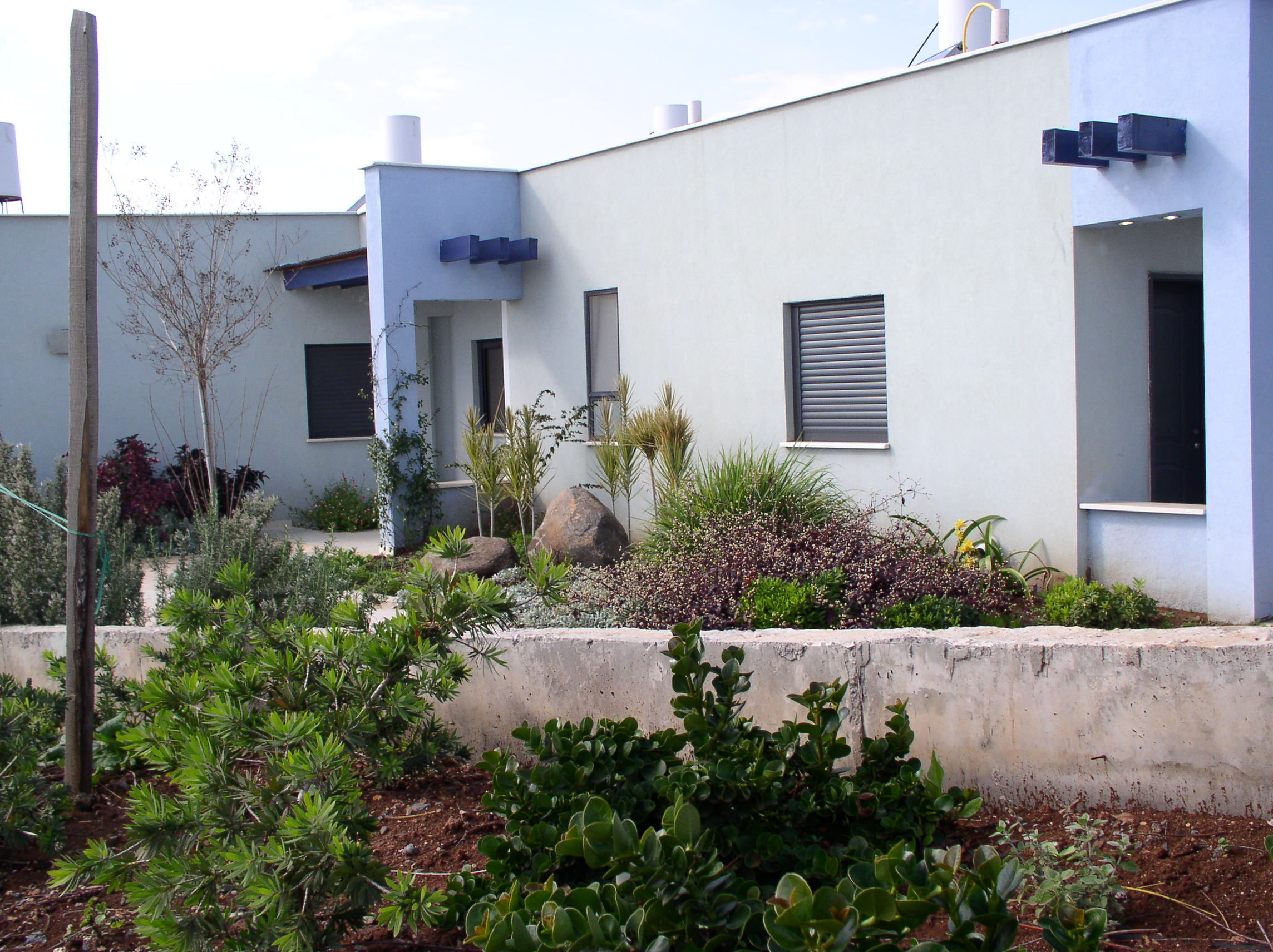פתיחה לכיוון הנוף. הבית ניבנה על מגרש עם נוף משני צדדים בלבד. הצורך היה בניית בית שלכל אחד מחדריו תהיה פתיחות משלו לנוף. הרעיון הוא בניית בית בצורת קשת כאשר, החדרים הם כמו פרוסות של עוגה והקירות המפרידים ביניהם בולטים החוצה בגוון תכלת ומהווים בסיס למצלות מול הנוף ובתוכם מושחלות קורות עץ גושני כחולות. התוצאה היא חדרים מול הנוף שכל אחד מהם שומר על פרטיותו.